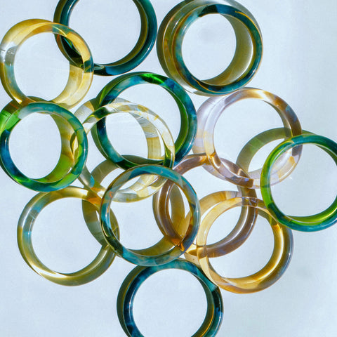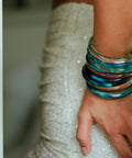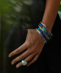 Much like every dawn and every dusk, each bangle is unique. Expect gentle variations in hue and pattern that dance with the light and change, that’s their charm. The silver settles on the molten glass in its own serendipitous way, bringing out different hues and patterns and making every bangle one of a kind.