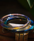 We infuse pure silver on to the surface of hot glass to make these bangles. Each bangle came out different. Soft iridescent clouds of color, like morning light or a fading sunset frozen in time. Every set has one clear and one deep bangle.