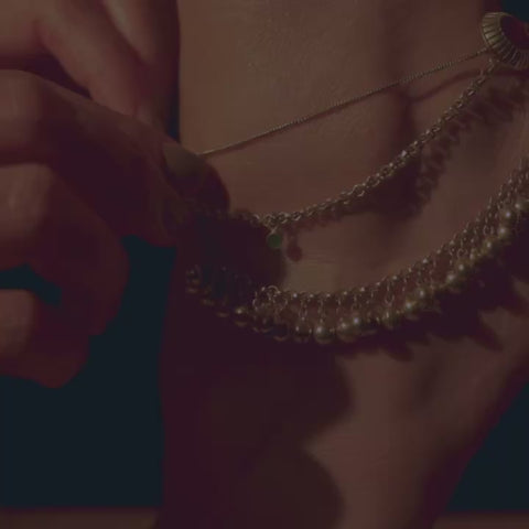 The Käma Anklet whispers before it’s seen—marking presence, pacing desire. In ancient texts, its chime was anticipation, a signal carried on air, a lover’s arrival felt before touch. With detachable ghungroos, it can shift between silence and song, drawing the senses to where pleasure begins—in movement, in awareness, in the forgotten language of the feet.