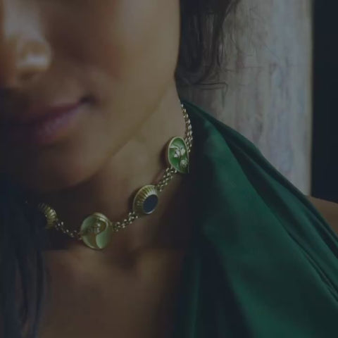 Legend has it that when Kamadeva turned to ash, love didn’t disappear—it scattered across the cosmos. It lives in a parrot’s song, a fish’s graceful swim, a lotus’s gentle bloom, the soft flicker of a flame, and the mysterious space that surrounds us. Bound into the Käma Choker, these five forces pulse on your neck with the fearless energy of a goddess.